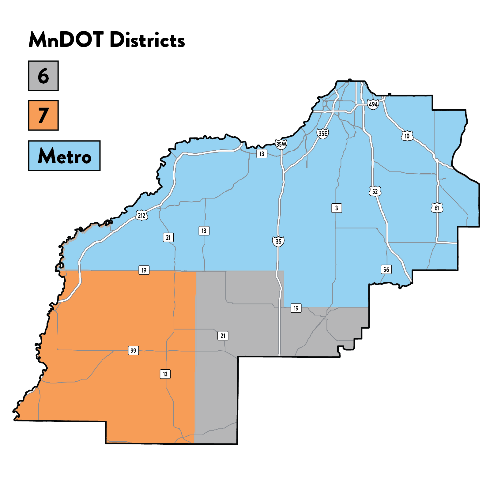 Congressional District 2 covers the south metro area and overlaps with parts of MnDOT District 6, MnDOT District 7, and MnDOT Metro District. Interstate highways I-35E and I-35W merge in the district in Burnsville. I-494 also passes through the northern portion of the district.