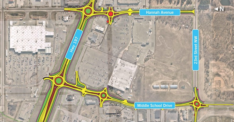 Between MnDOT and the City of Bemidji, six roundabouts will be constructed between 2025 and 2027. MnDOT will replace the signalized intersections along Hwy 197 at Hannah Avenue, Middle School Drive, and the Menard's access road.