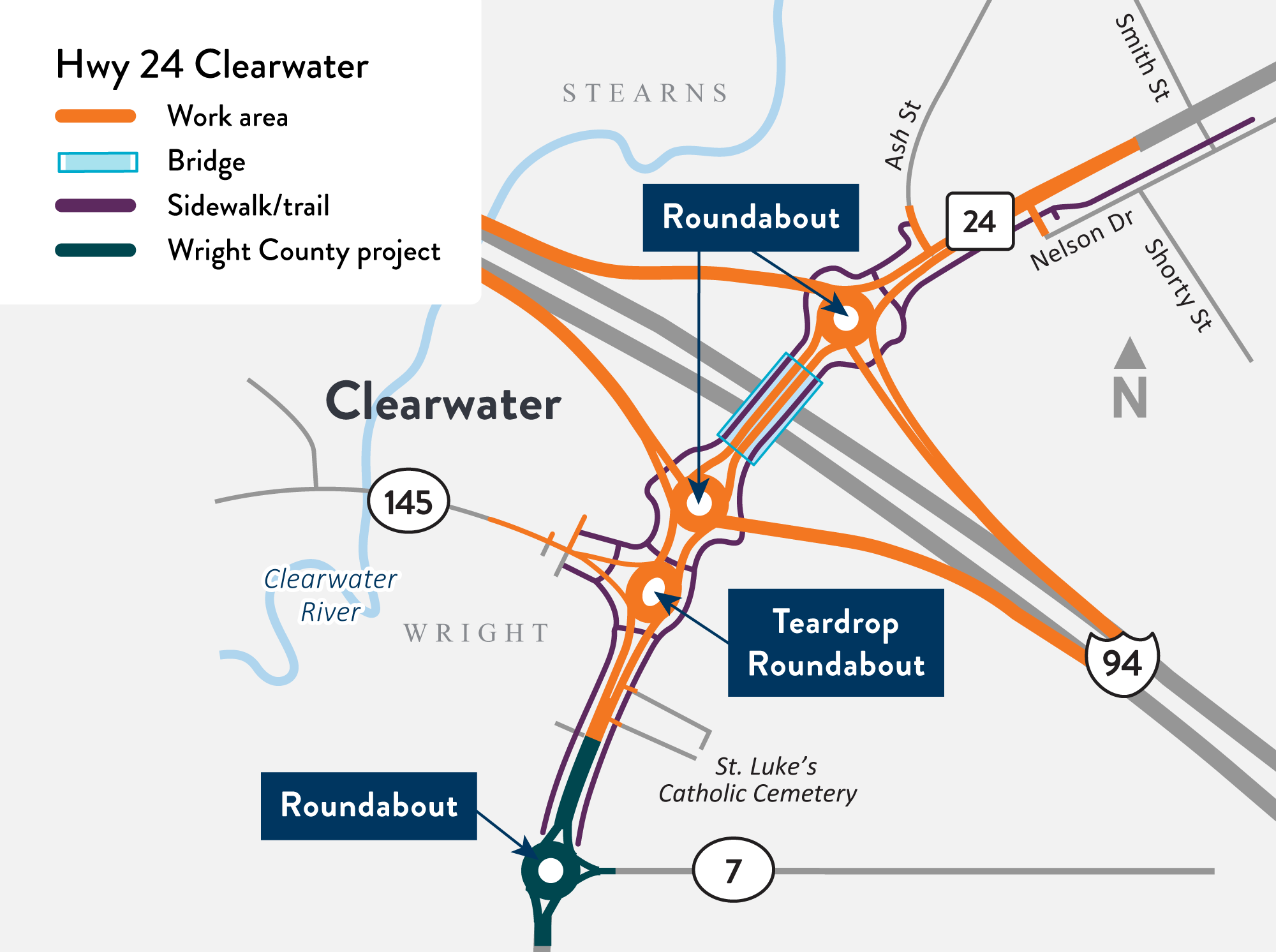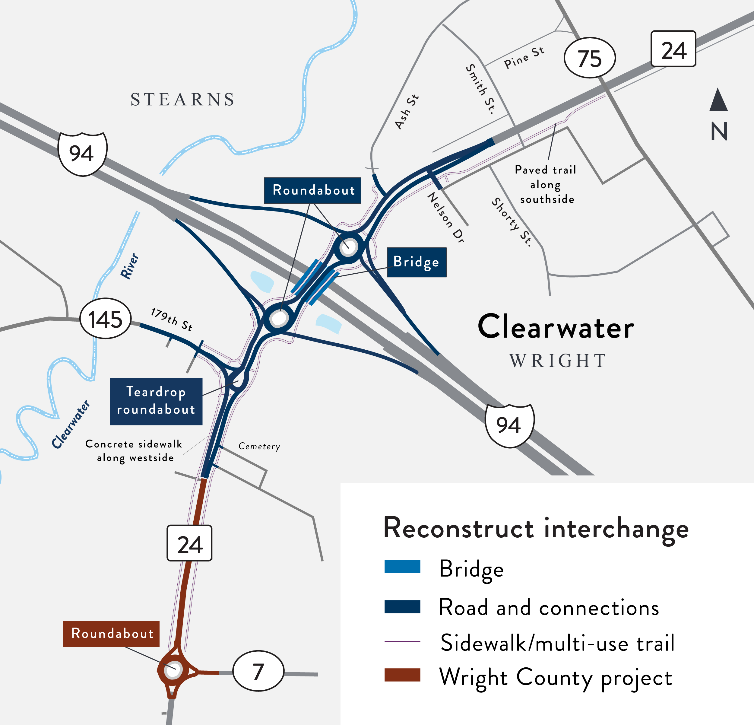 MnDOT will reconstruct and improve the Hwy 24 interchange at I-94 in Clearwater, Wright County, includes roundabouts and a new bridge in 2026-2027. Hwy 24 will remain open to traffic at most times with the exception of some overnight closures for bridge work.