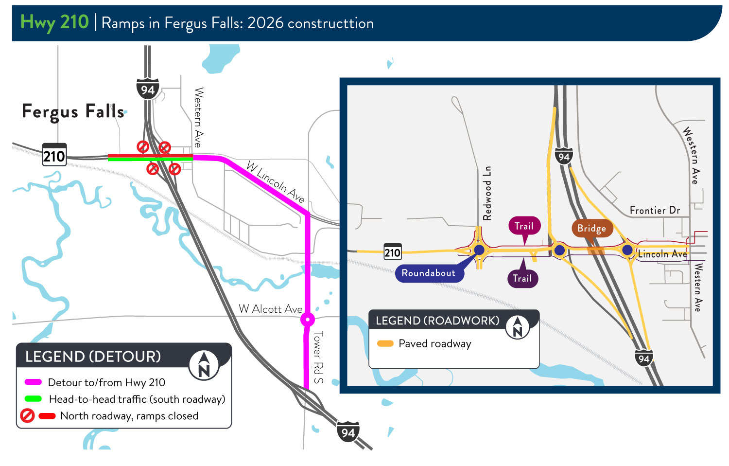 - The interchange ramps will close to all travelers during construction. Traffic to/from Highway 210 in Fergus Falls will be detoured to County Road 1/Tower Road.