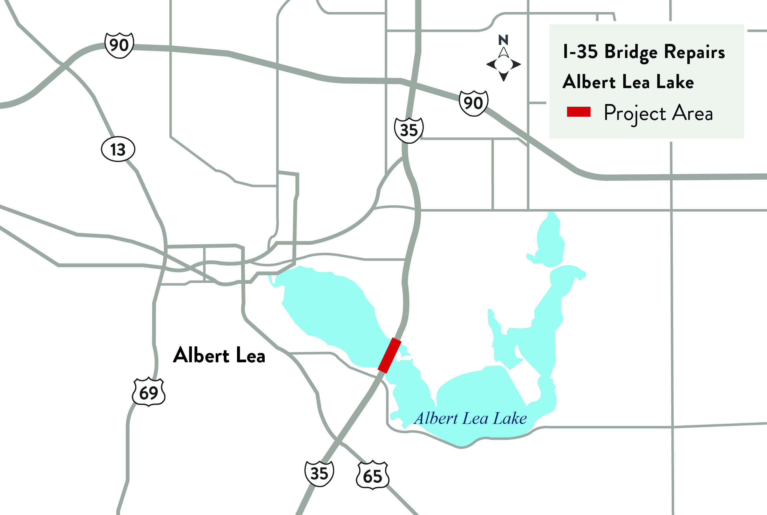 Repairs on I-35 southbound and northbound bridges over Albert Lea Lake are scheduled to begin June 2026. It is expected to be completed in October 2026.