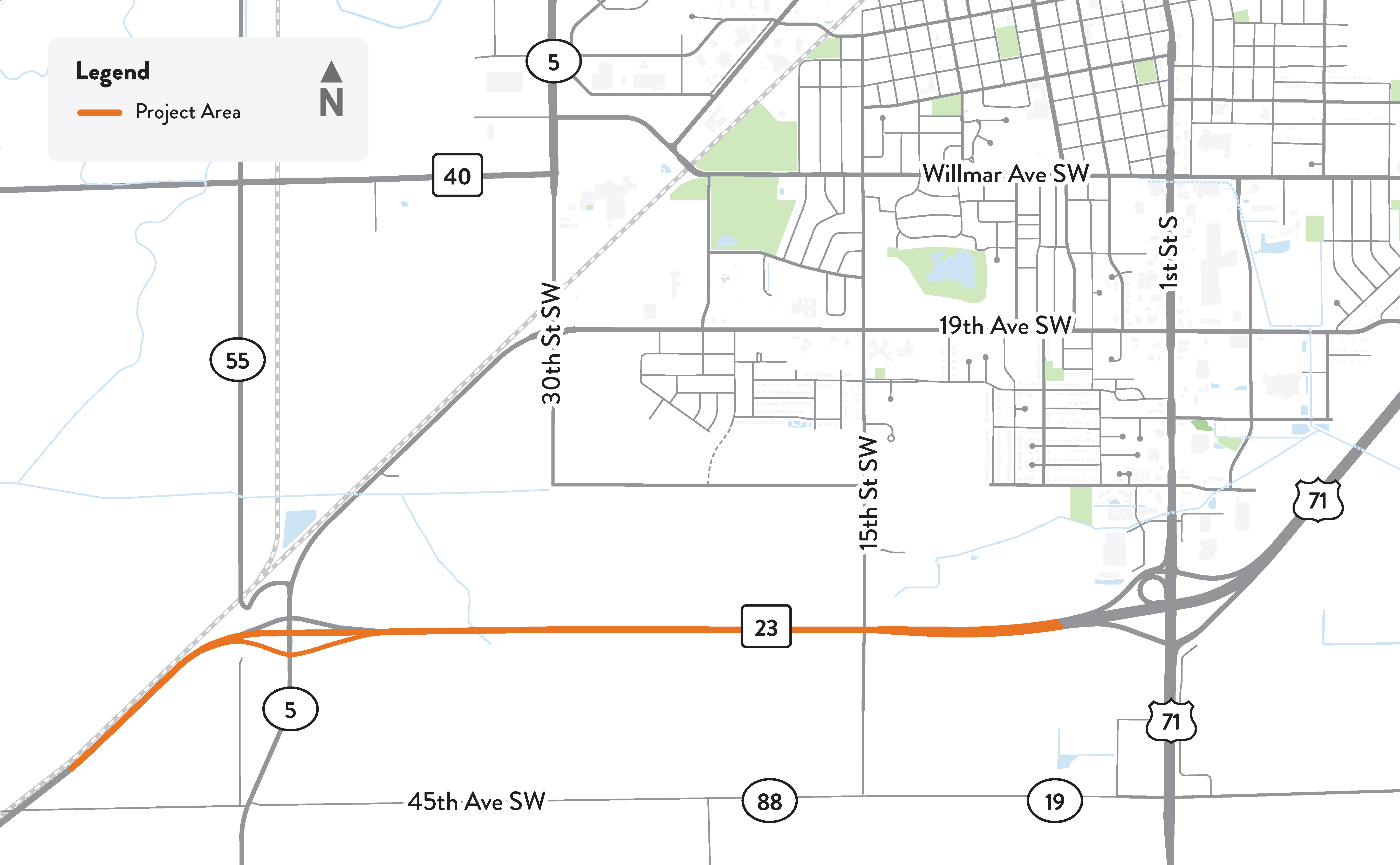 MnDOT is planning to expand Highway 23 from west of Kandiyohi County Road 5 to Highway 71 southwest of Willmar. The project will upgrade about 3.5 miles of Highway 23 from a two-lane road to a four-lane highway. Additional work includes realigning the entrance/exit ramps to properly connect with the new eastbound lanes, installing new guardrails to meet current safety standards, inspecting and replacing drain tile crossings as needed, and constructing stormwater treatment ponds.