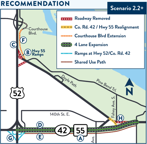 Map of the study area showing scenario 2.2 plus concepts including Highway 55-42 roadway will be expanded from a two lane undivided segment to a four-lane divided segment between highway 52 and east of Fahey Avenue