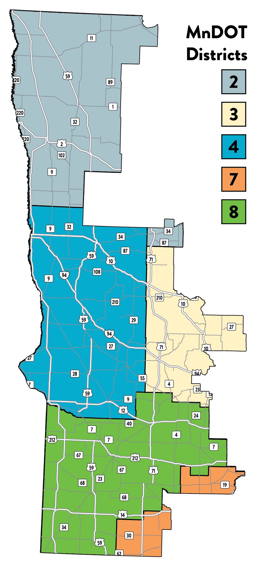 The Lower Sioux Indian Community and the Upper Sioux Community are located in the southern portion of Congressional District 7. Portions of the Mille Lacs Band of Ojibwe and Red Lake Nation live in the north, and the district borders the White Earth Nation. A member from the Mille Lacs Band, Red Lake Nation, and White Earth Nation sits on at least one ATP, and our Tribal Affairs staff consults with tribes annually to discuss transportation issues and projects.