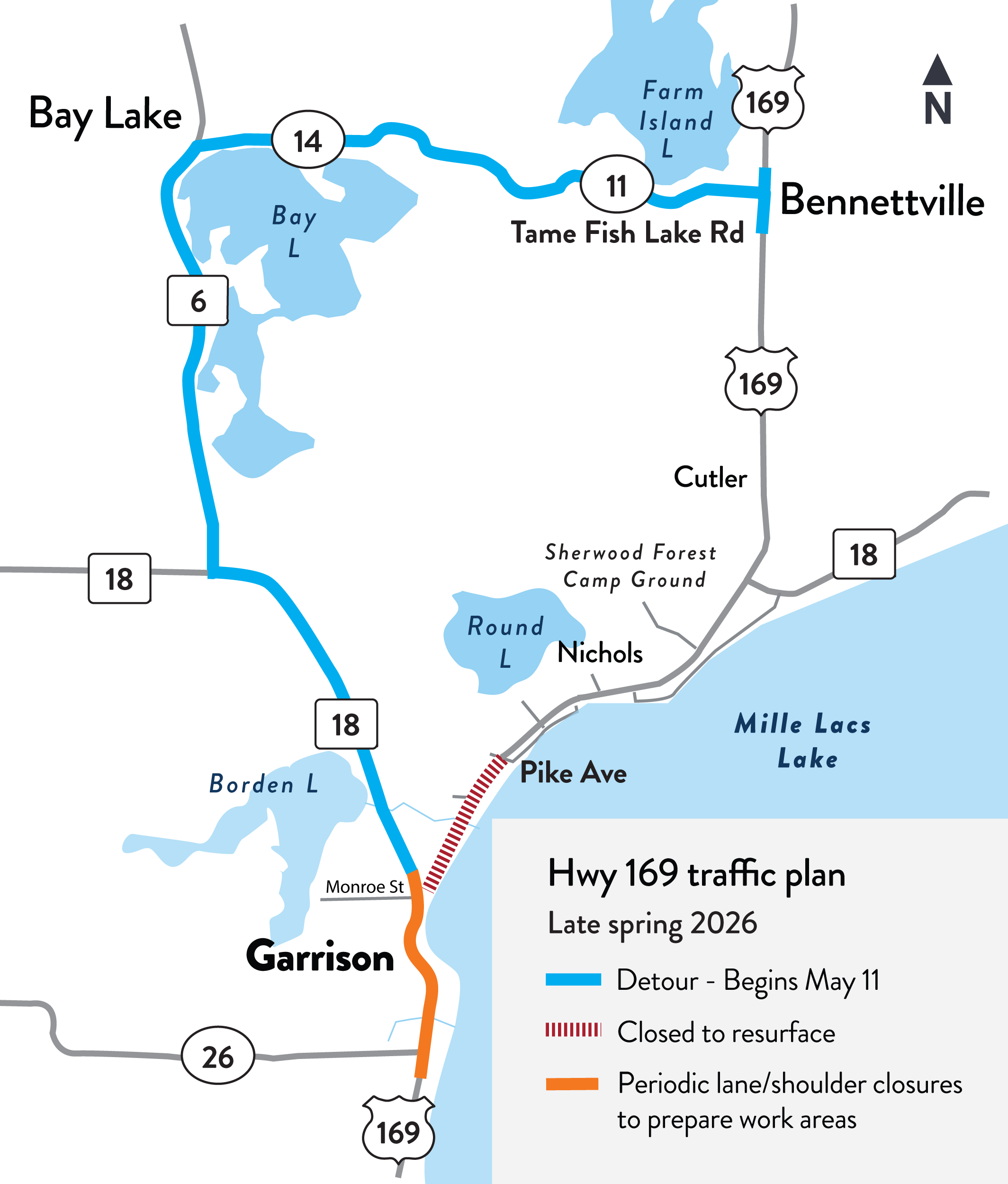 MnDOT will improve five miles of Hwy 169 from south of Garrison at Crow Wing Co. Rd. 26 to north of Garrison at Pike Ave.; includes city storm sewer, sidewalk and a new roundabout at the busy Hwy 18 intersection.