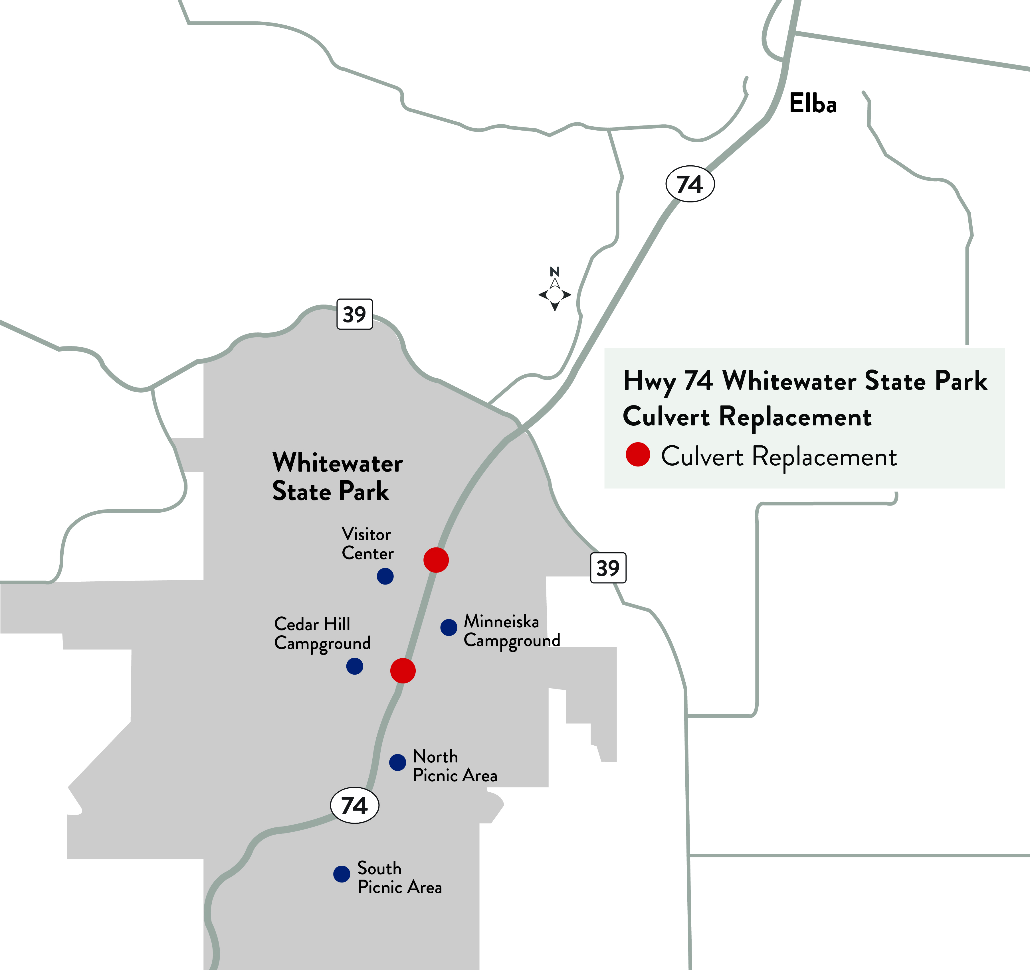 South culvert: The detour route into the park when the south culvert is being replaced will depend on your destination on Hwy 74. If you are traveling to the town of Elba or activities north of the park or the park visitor center, RV sanitation station, Cedar Hill Campground, or the Minneiska Campground, you will travel west on Winona Co Rd 22/Olmsted Co Rd 9 to Olmsted Co Rd 10 north to Olmsted Co Rd 2/ Winona Co Rd 39 east to Hwy 74 south.
