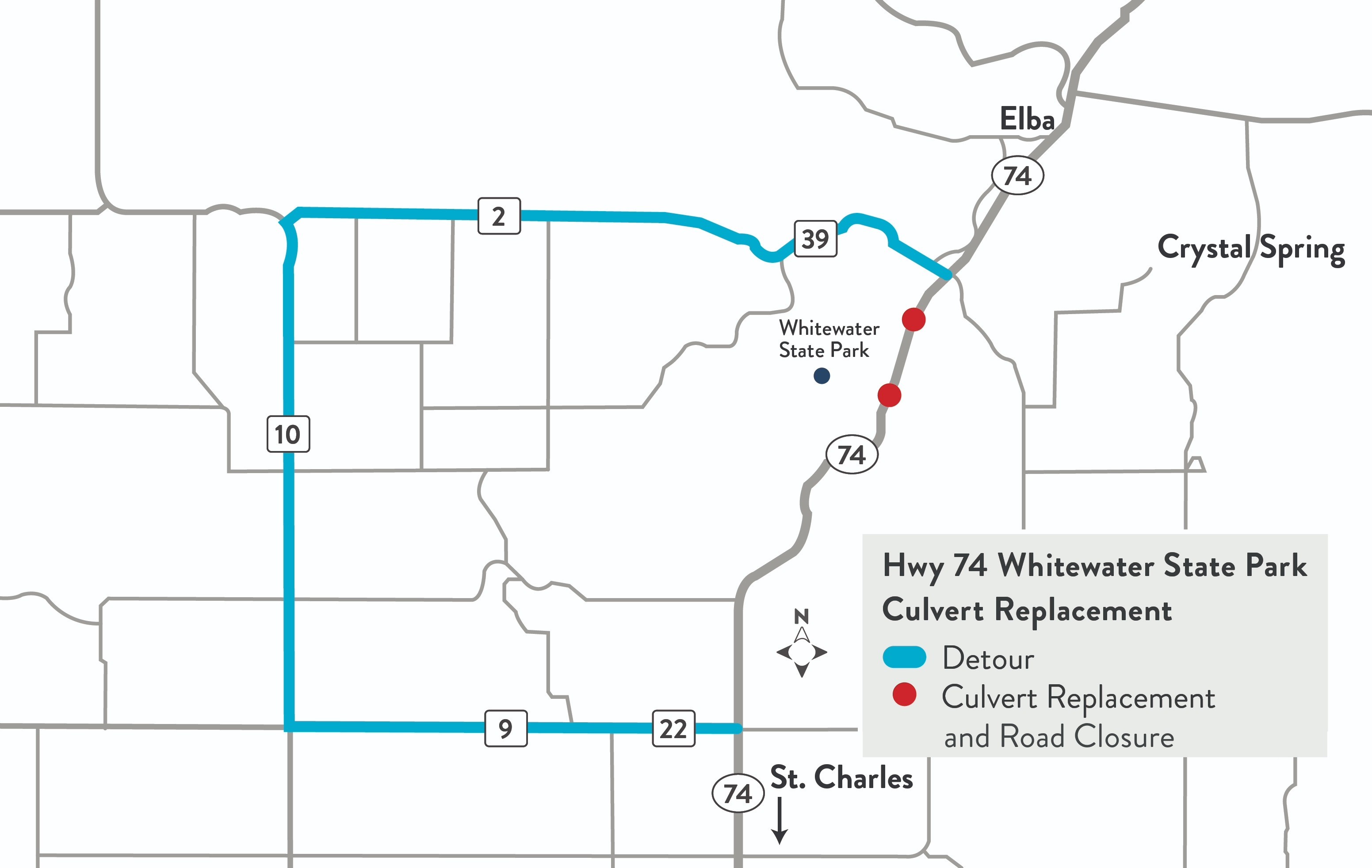 North culvert: The detour route for travelers from the north going into the park when the north culvert is being replaced will be Winona Co. Rd. 39 /Olmsted Co. Rd. 2 west to Olmsted Co. Rd. 10 south to Olmsted Co. Rd. 9/Winona Co. Rd. 22 east to Hwy 74 north.