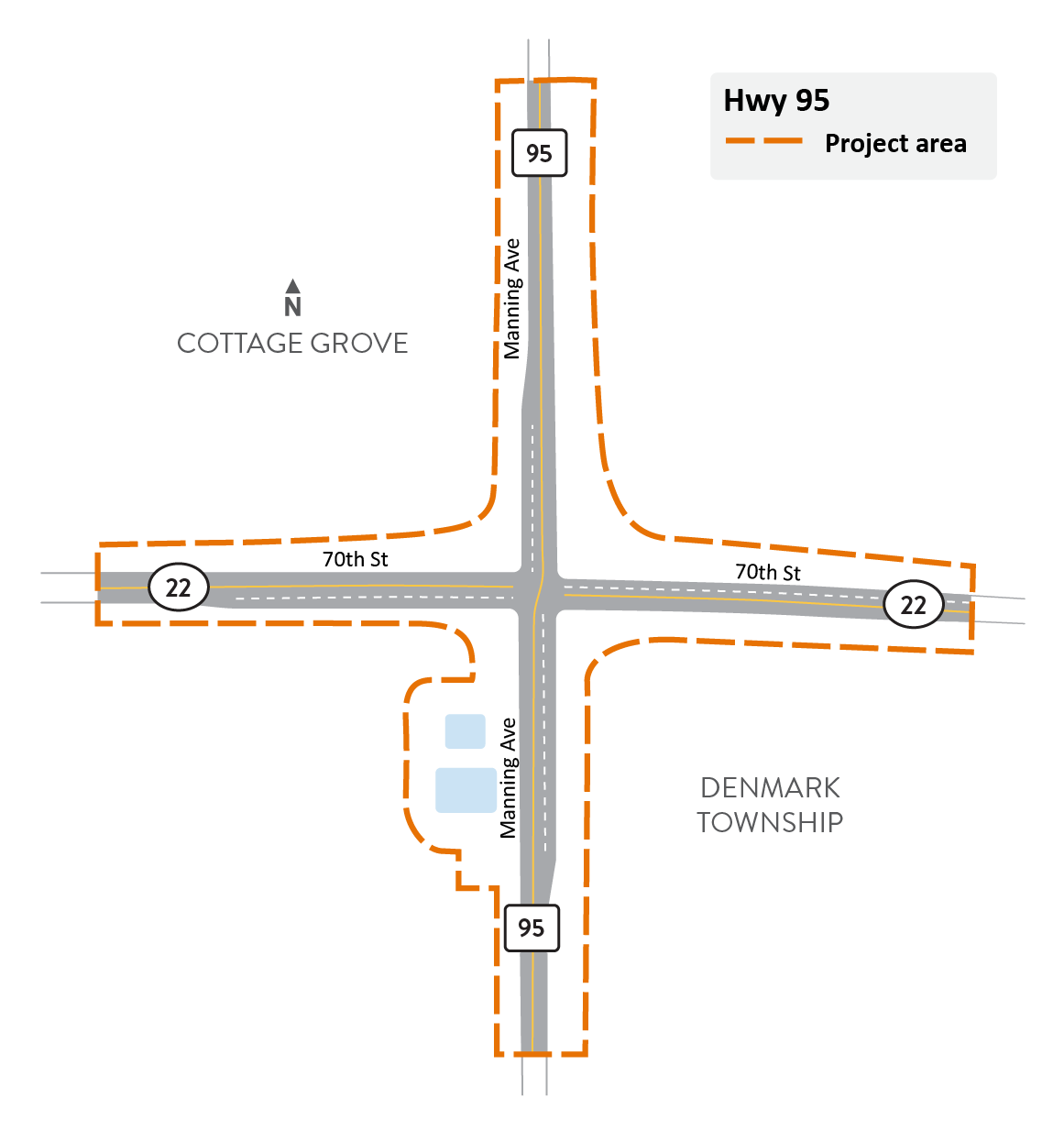 Starting in spring 2026, Hwy 95 in Denmark Township in Washington County will undergo a safety improvement project. Crews will improve traffic flow and safety with the construction of a single lane roundabout at the intersection of Hwy 95 and Hwy 22/70th St.