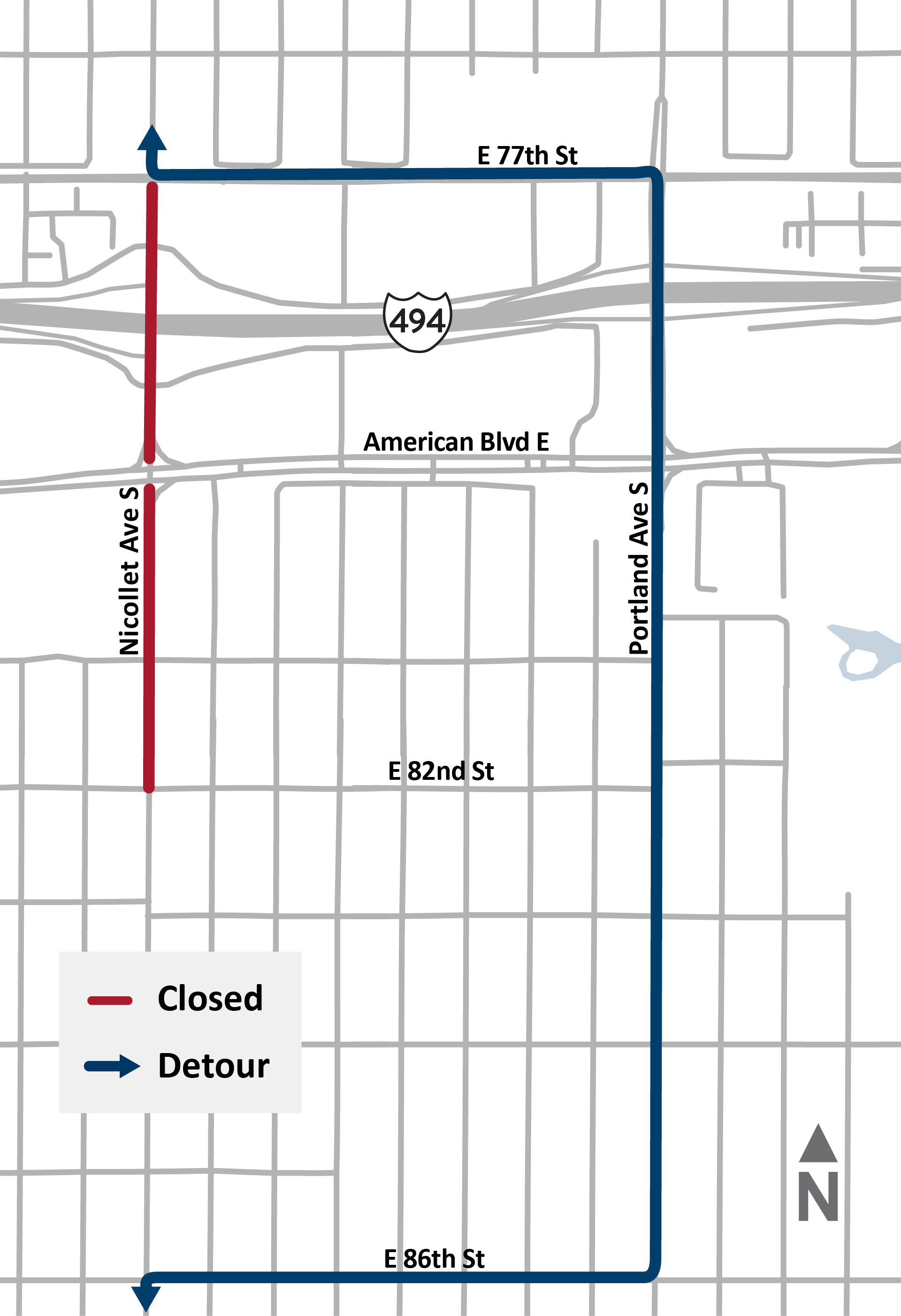 - Nicollet Ave. is closed between American Blvd. and 82nd St.