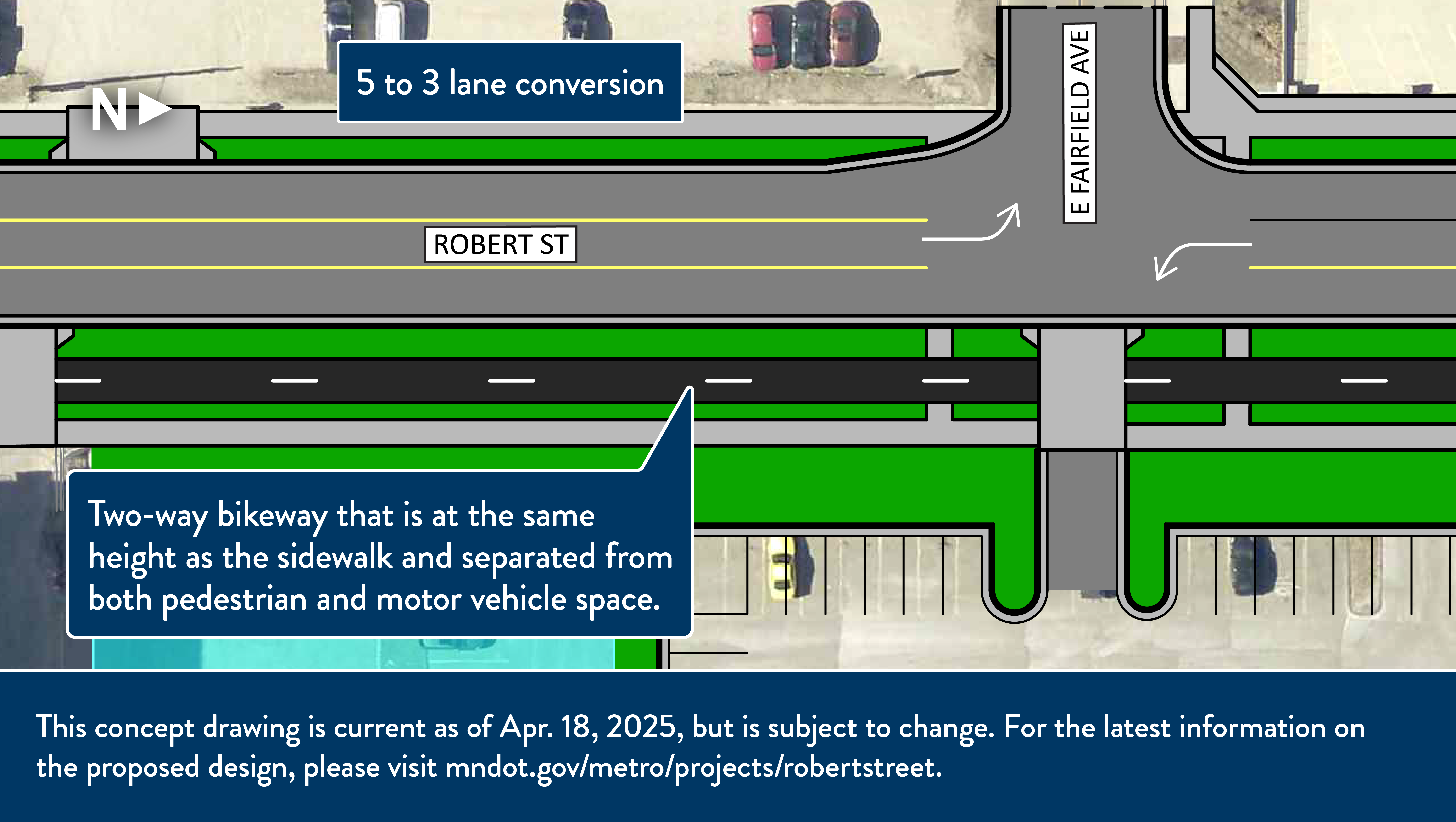 In fall 2024, we shared a proposed design for Robert St. focused on improving safety for everyone – whether walking, bicycling, rolling, using transit or driving. We received comments from hundreds of community members. Below is a summary of what we heard from the community and how we incorporated this feedback in the final design. The images from the design layout are current as of April 4, 2025. We continue to revise the concept plans and will post any changes to this website.