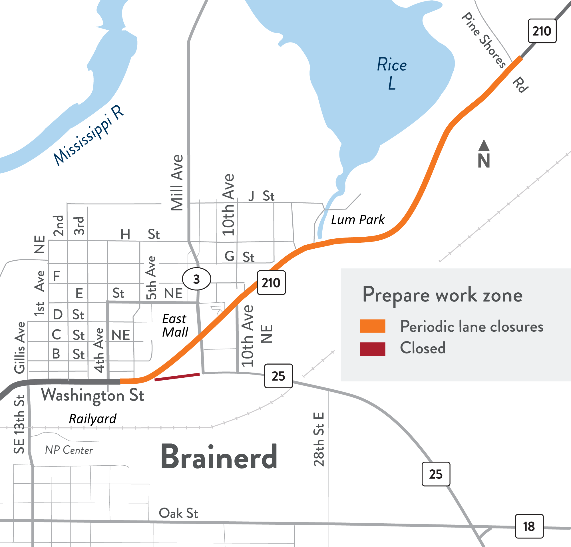 - Mid-May to early August work zone map (PNG): Construction will begin on the two roundabouts in the mall segment. Hwy 210 will reduce to one lane each way and go around the closed work zone between 10th and Fifth Ave. NE