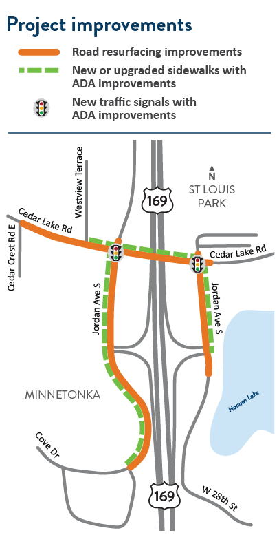 - Build new sidewalk along east side of Jordan Ave. South from the Hwy 169 northbound ramps to Cedar Lake Rd. in St. Louis Park