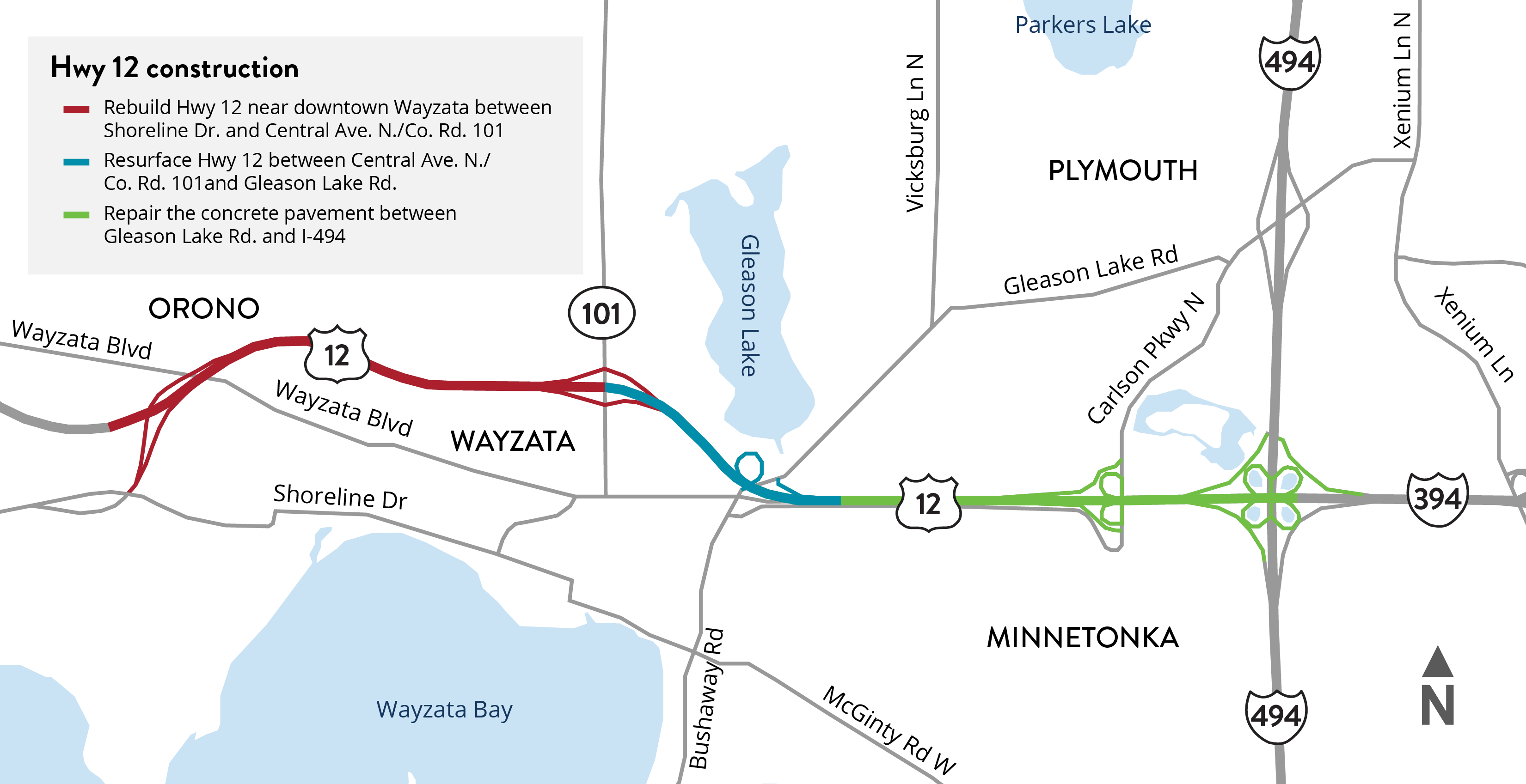 We are repaving Hwy 12, replacing lighting, and making accessibility improvements between Central Ave. North in Wayzata and I-494 in Minnetonka. We will also be repairing ramps along this section of Hwy 12.