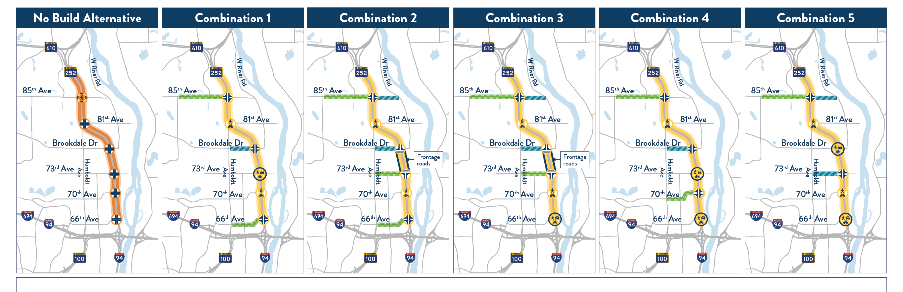 In summer 2025, we evaluated five options called “Access Combinations” for where drivers could enter and exit Hwy 252. We also considered a No Build Alternative to understand how each option would perform. The graphic below shows each Access Combination. As part of the evaluation, we looked at how well each option could improve safety and mobility, reduce property impacts, and support emergency response times. Please visit our access combination website to learn more.