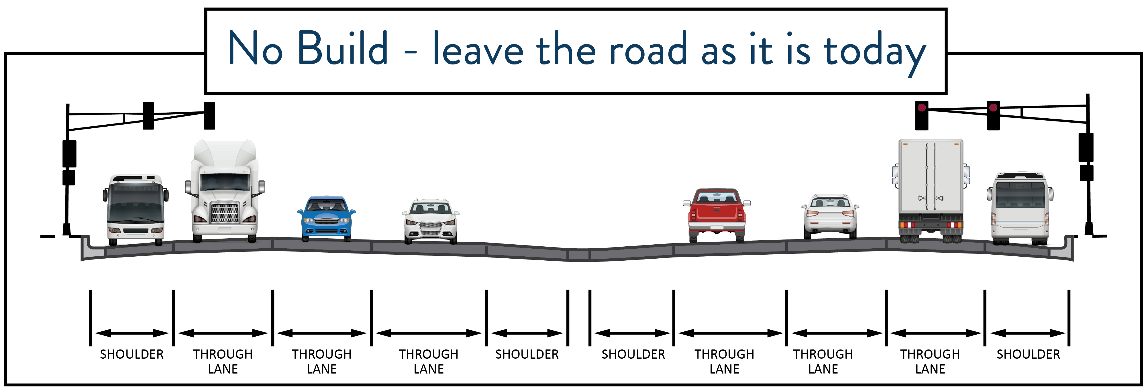 All options besides “keeping the road as it is today” include changing the roadway from an expressway (road with ground-level traffic signals) to a freeway (road with overpasses/ underpasses and interchanges with on/off ramps).