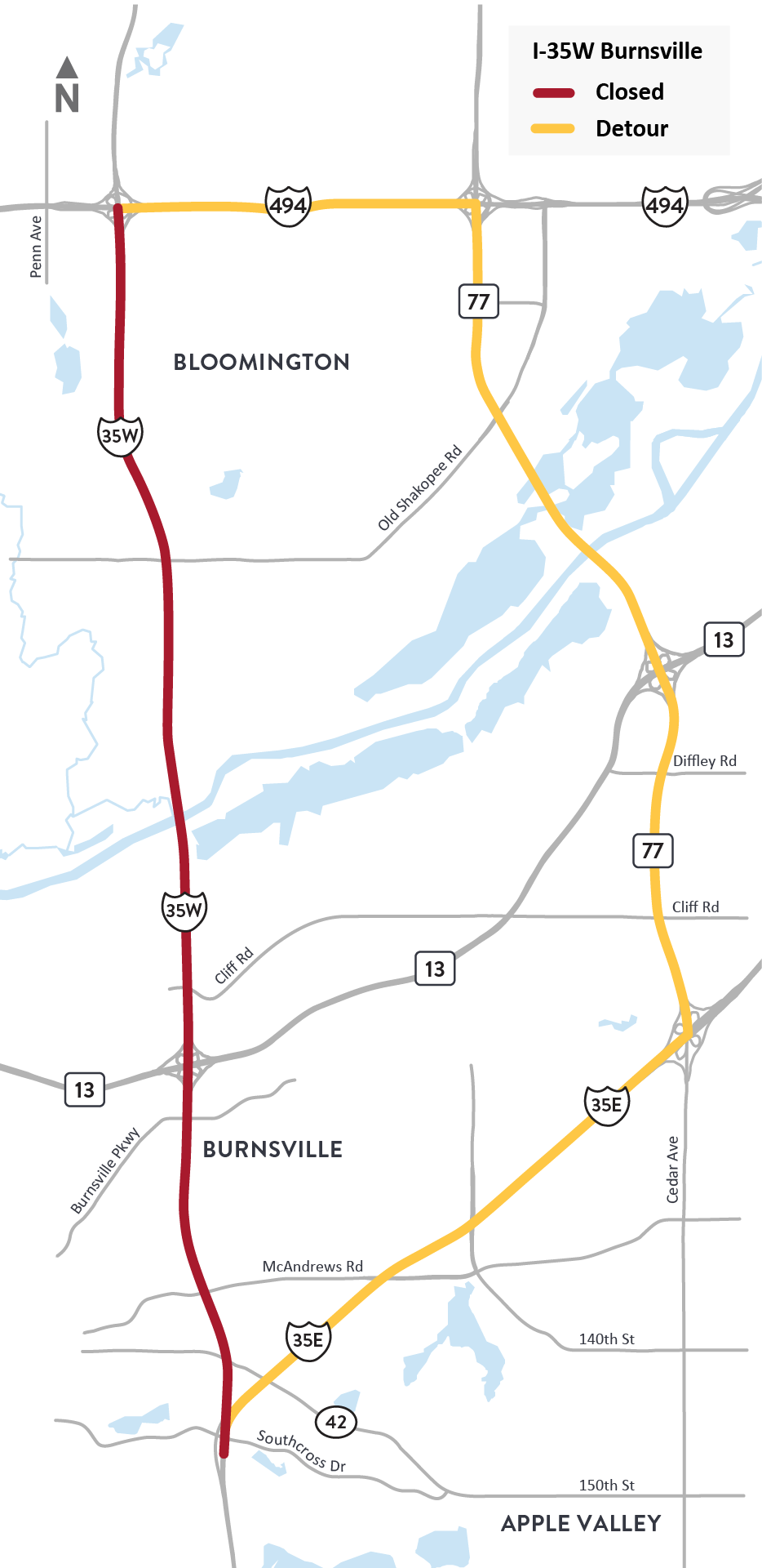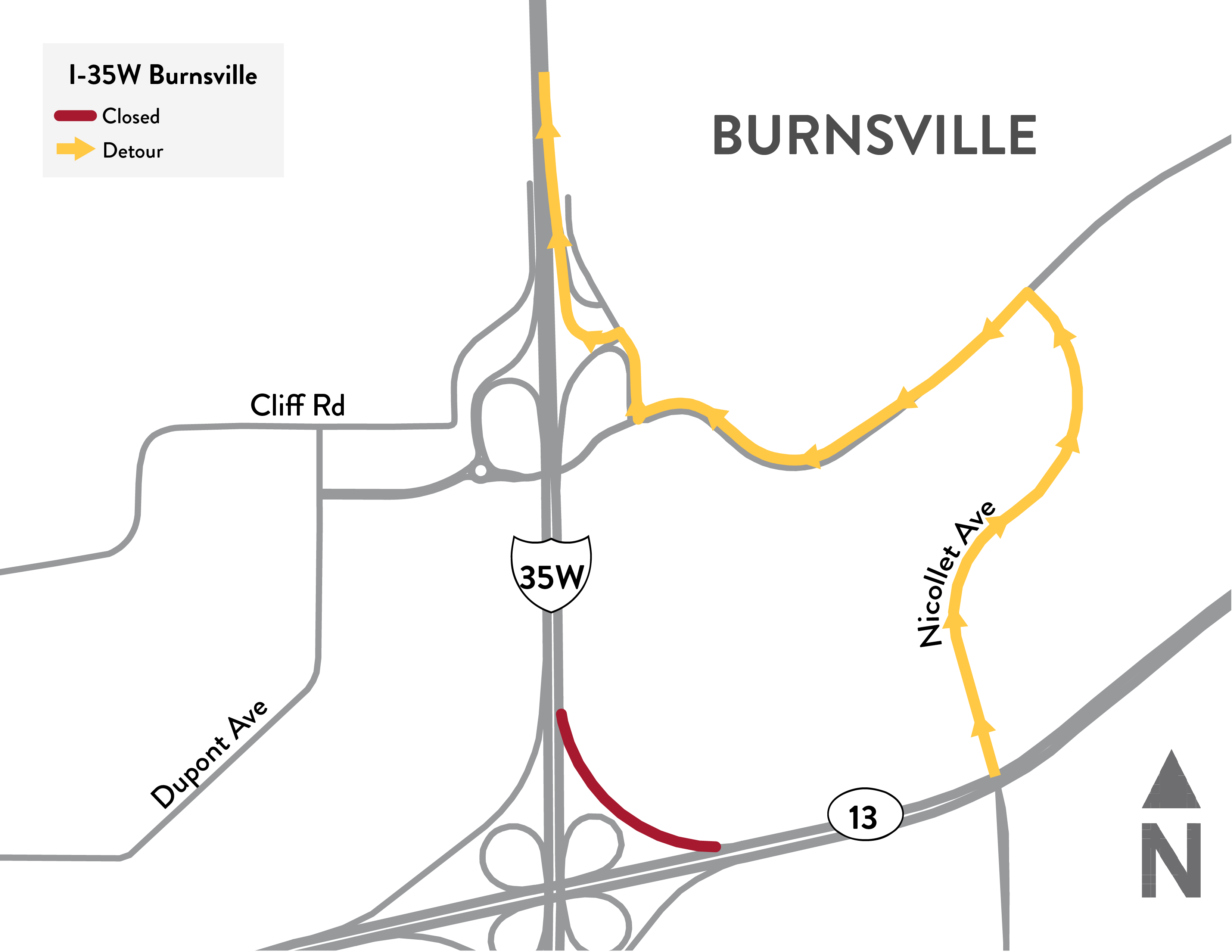- Detour (eastside of I-35W): Northbound I-35W to Burnsville Pkwy. to Nicollet Ave. to Cliff Rd. (PNG)
